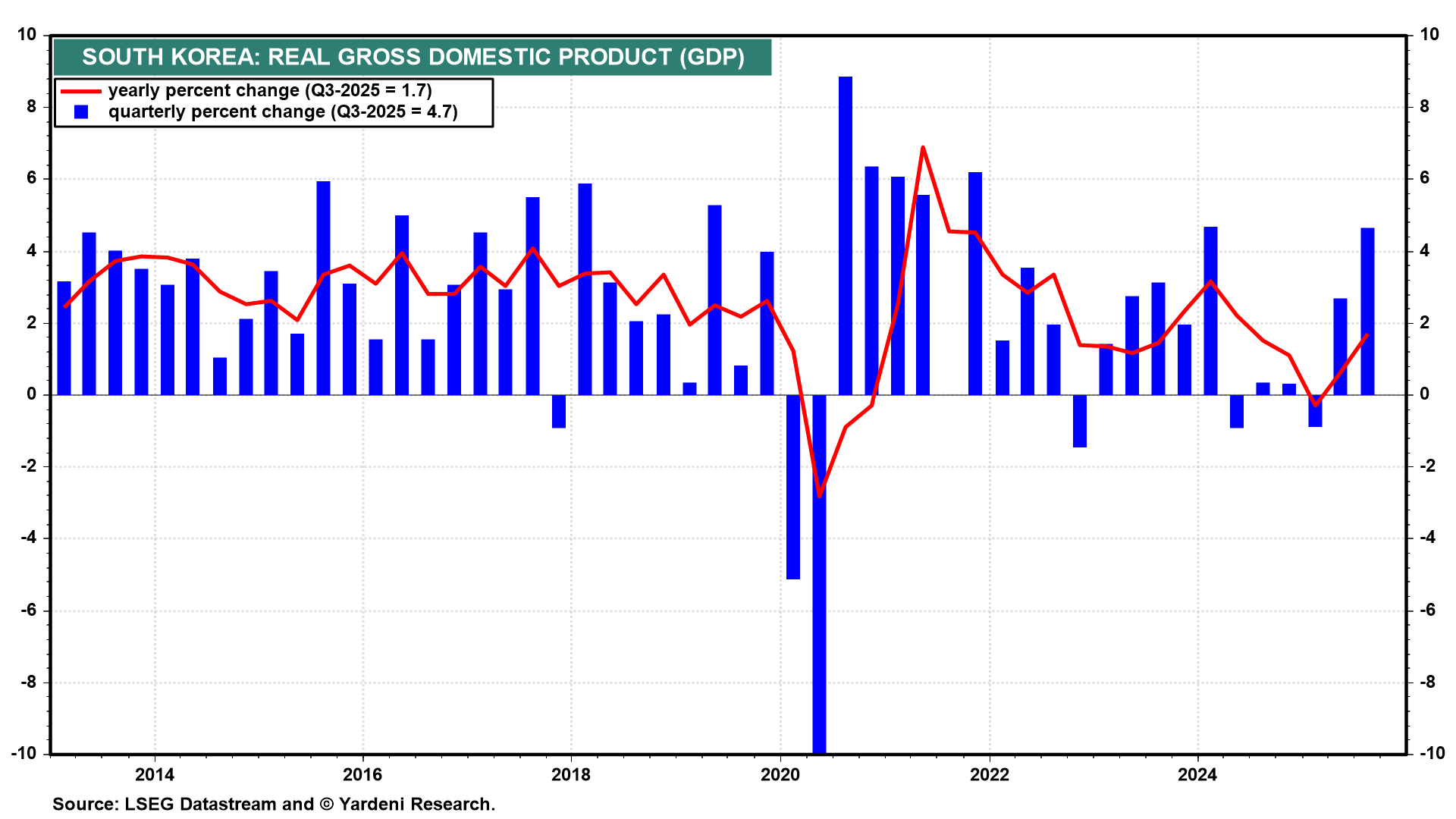 Executive Summary: China has a shot at overshooting the government’s 5% GDP growth target in coming years, William reports, if it keeps its exports flowing, as they have been, to developed nations other than the US. But this would risk geopolitical collision with President Trump’s vision for US-China trade. … Also: South Korea’s stock market is up dramatically so far this year, reflecting newfound political stability, faith in the government’s reform plans, and exposure to the AI boom. Is the bull run sustainable? Several geopolitical, economic, and reform-related obstacles lie ahead.