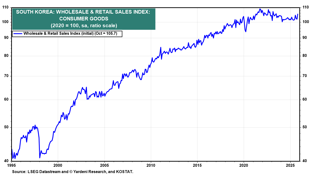 (3) Remarkable resilience. Australia’s home prices are rising, too, as credit growth accelerates. Discretionary spending is increasing. Household consumption rose 5.1% y/y in September. “Household resilience has been remarkable,” notes Belinda Allen at Commonwealth Bank.