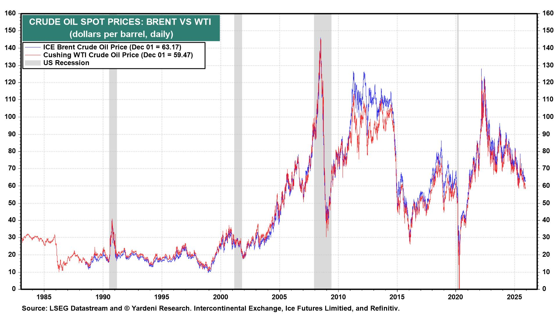 (1) Geopolitical tensions. Of course, caveats abound for both economies and the global economy writ large. No one can say what Trump might do with tariffs over the next 12 months. Geopolitical risks from Russia versus Ukraine, the US versus Venezuela, and China versus Japan have oil markets on edge (Fig. 10).