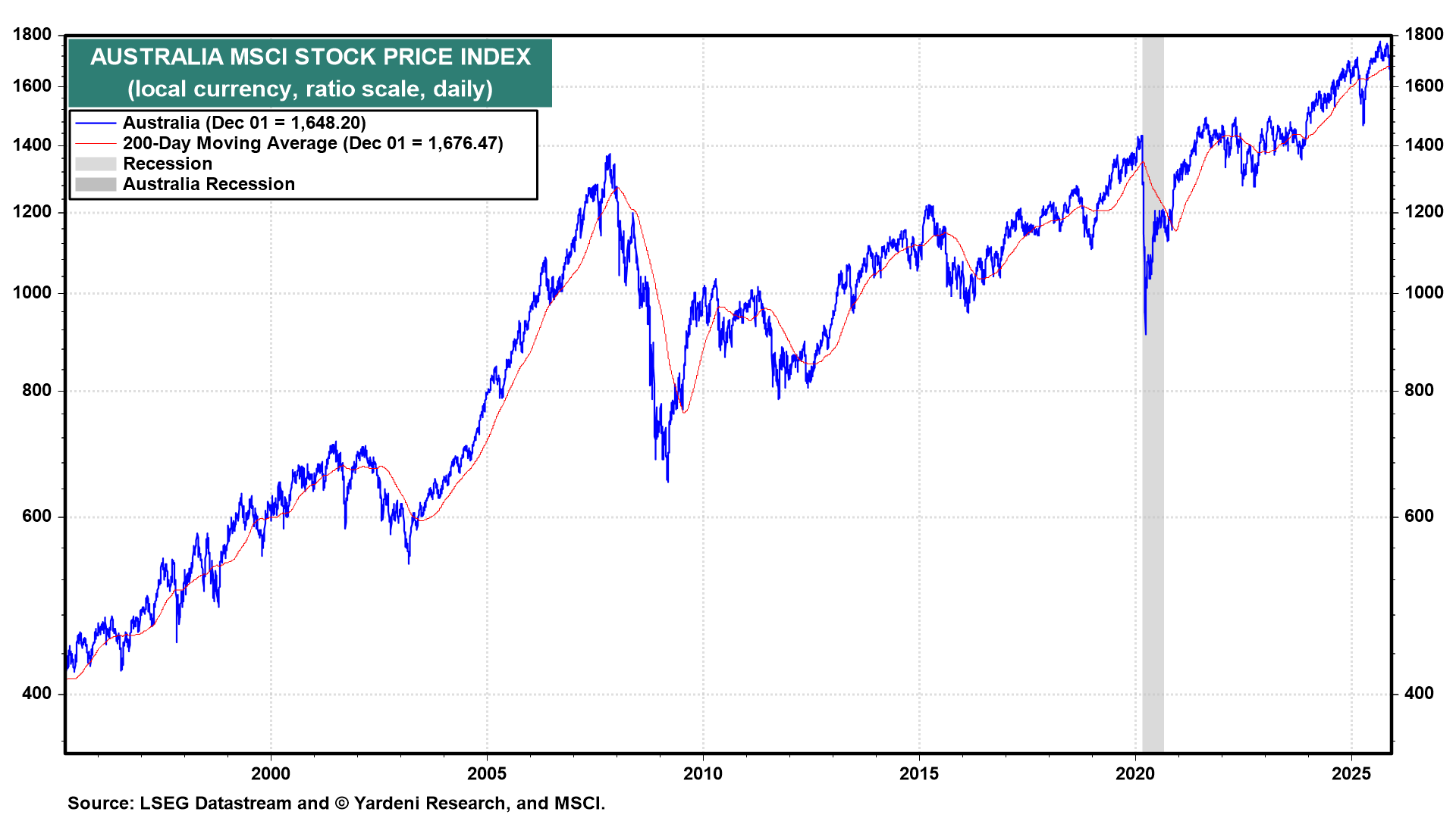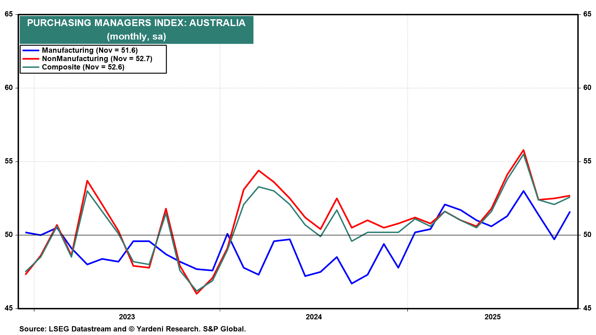 Australian Economy I: Strength Down Under May Augur Well for US. The nearly 9,800 miles separating Reserve Bank of Australia (RBA) Governor Michele Bullock and Federal Reserve Chair Jerome Powell can be viewed a topographical metaphor—for the gulf between the decisions that the two central bankers face as 2025 draws to a close. For Bullock, the question is when to hike interest rates; for Powell, it’s when to lower them once again (Fig. 7).
