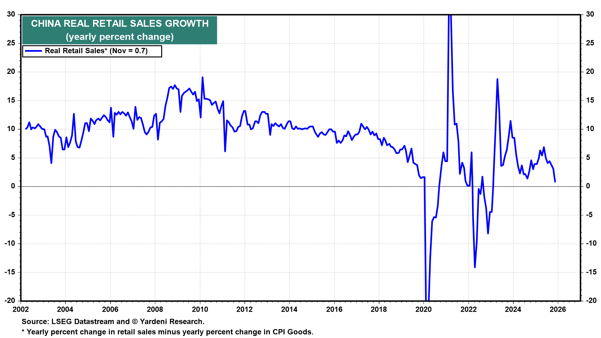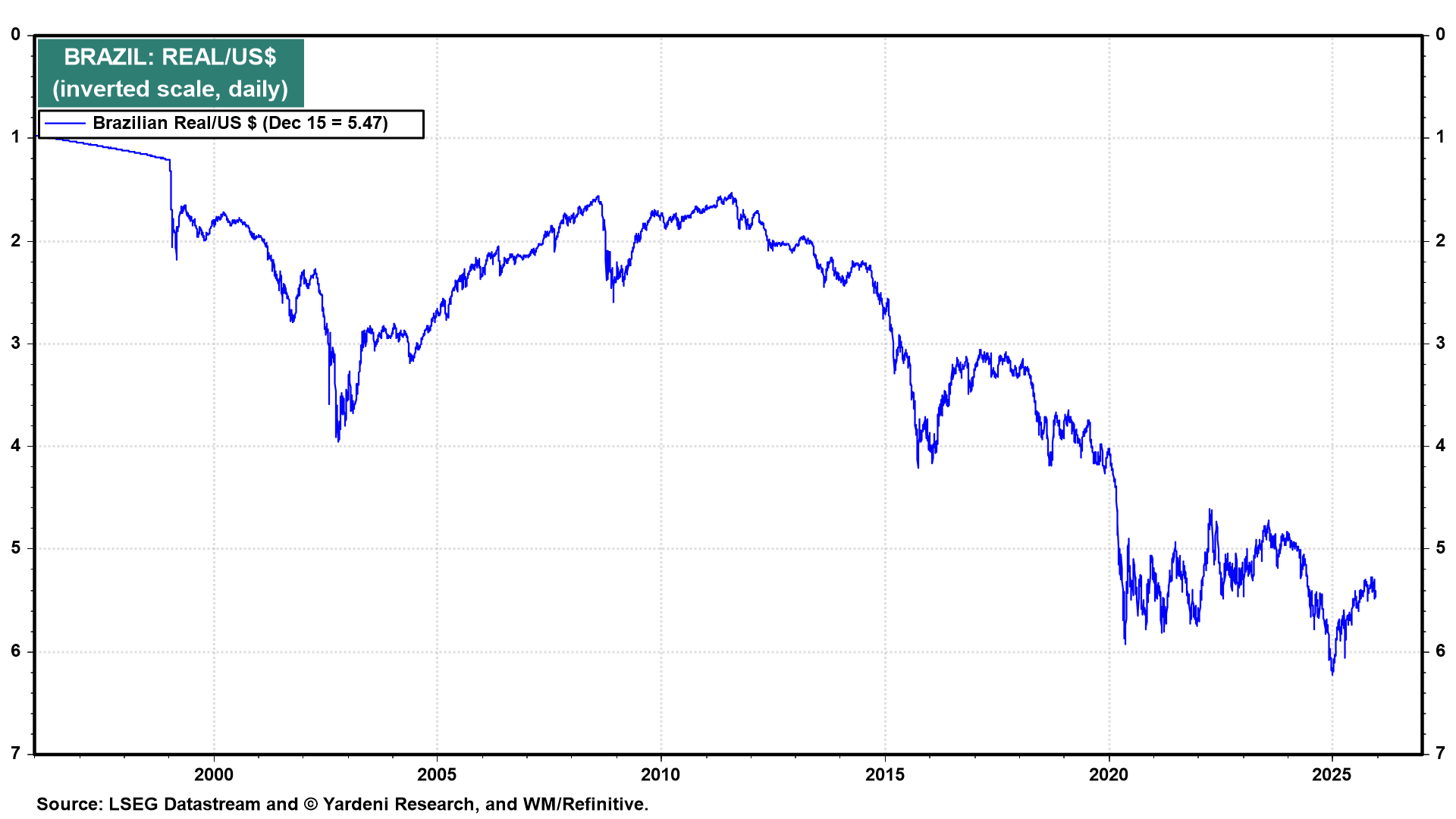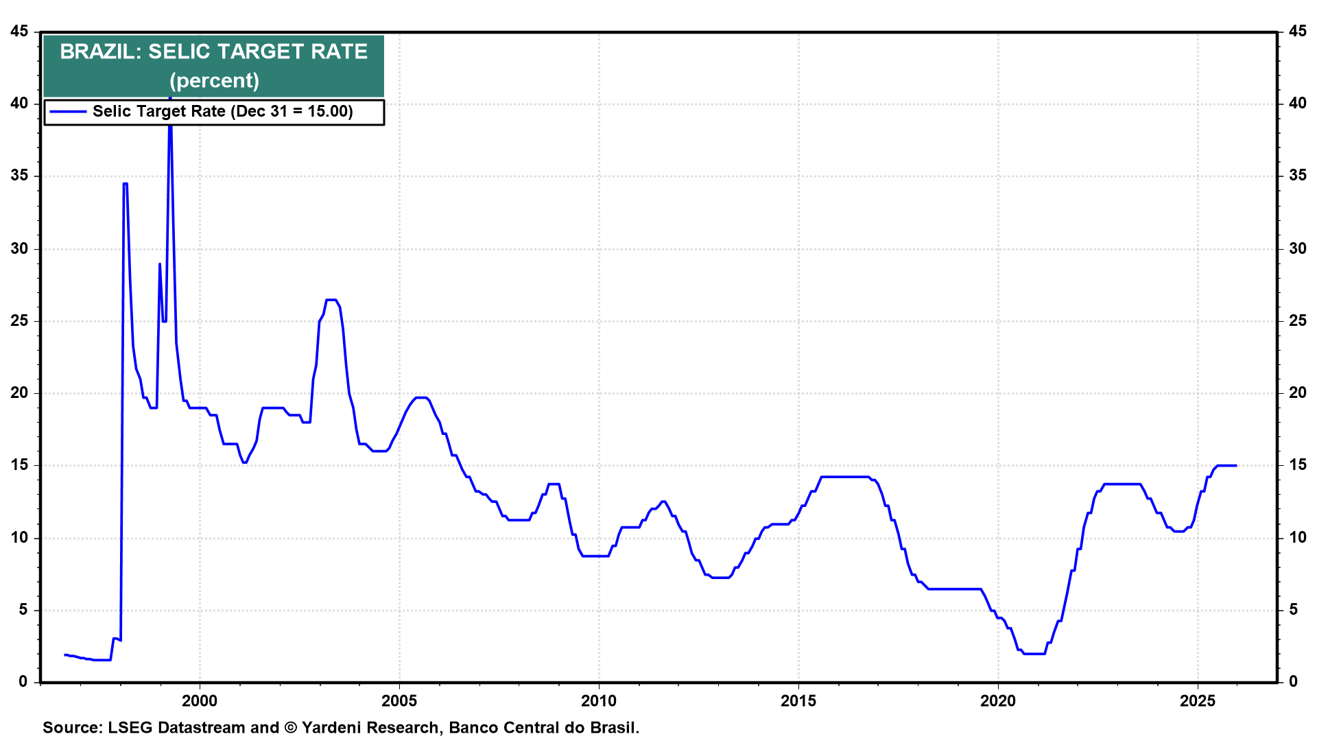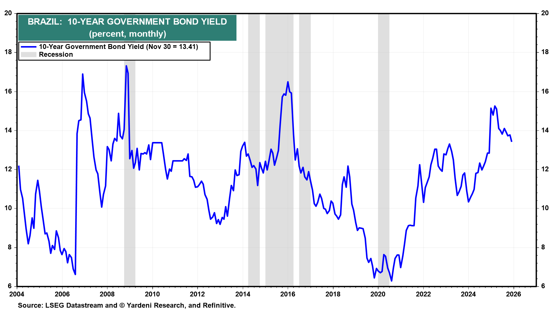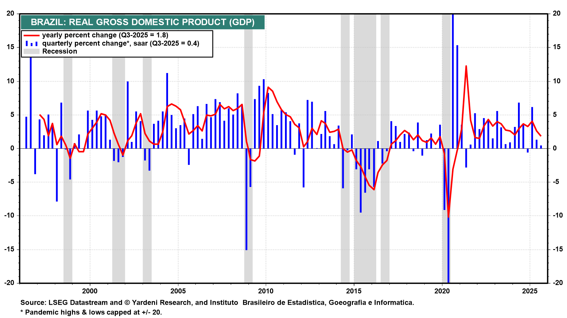 Similarly, Galipolo is in the hotseat for keeping interest rates at a Volcker-esque 15% as GDP growth approaches contraction territory. In Q3, Brazil’s GDP rose just 0.4% q/q (saar) (Fig. 2). Retail sales have now declined in five of the last six months. On Monday, the central bank reported that its economic activity index, a widely tracked proxy for GDP, weakened unexpectedly in October by 0.25% m/m. The outlook for Brazil’s economy 2026 seems precarious.