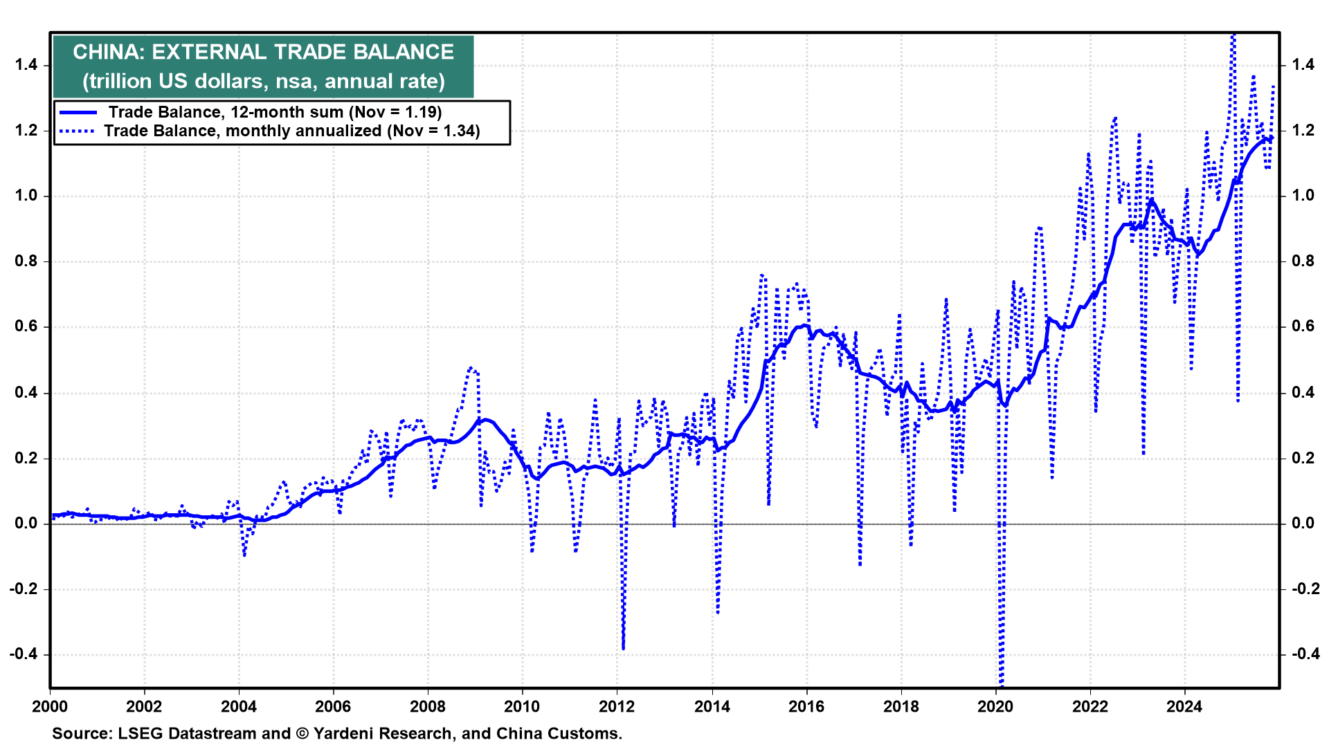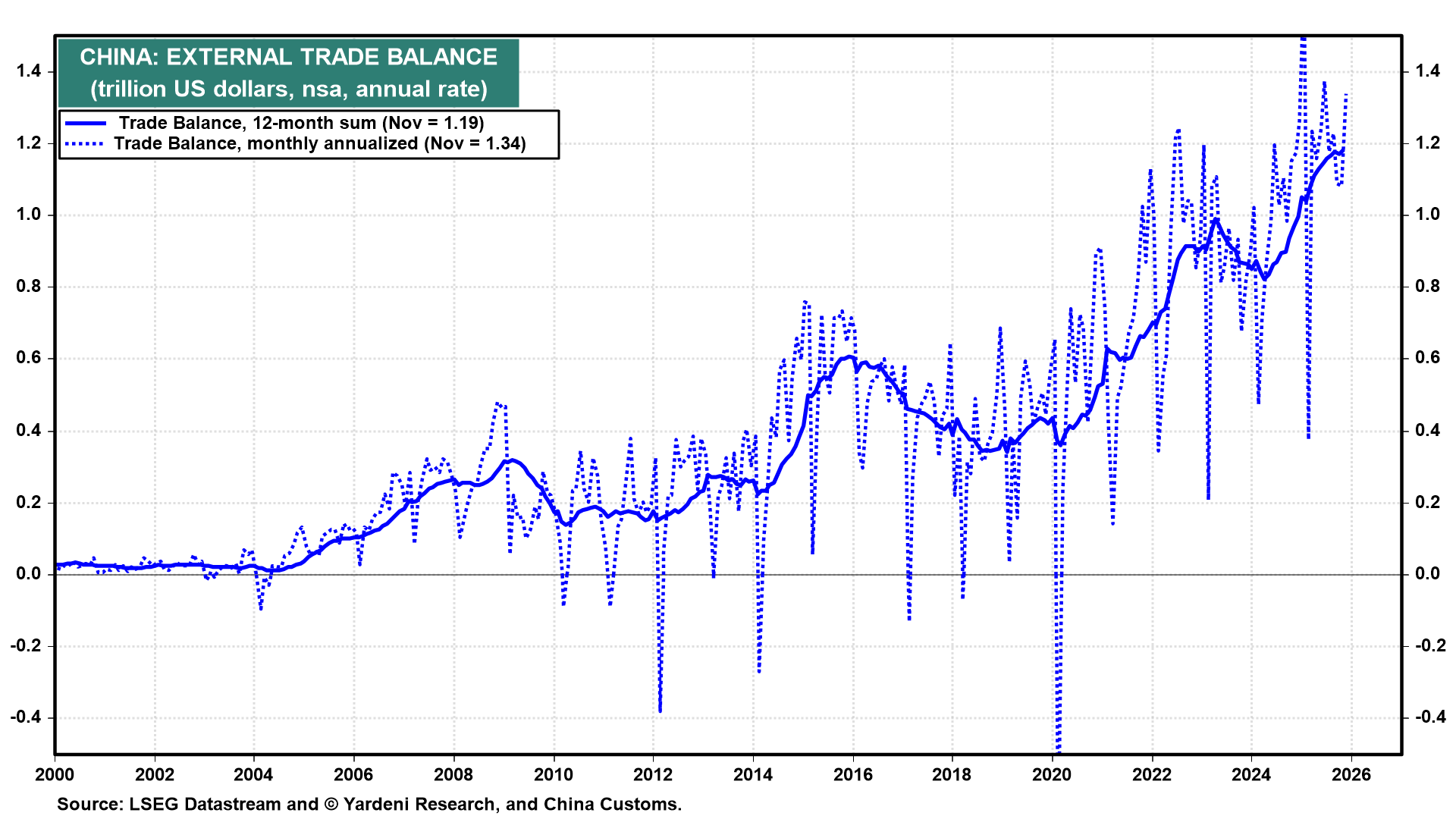 (1) Mexican diversion. In November, China’s global exports rebounded (up 5.9% y/y), pushing the monthly trade surplus to about $112 billion. The rebound pushed China's 12-month surplus on non-US trade over $1 trillion for the first time ever (Fig. 8).