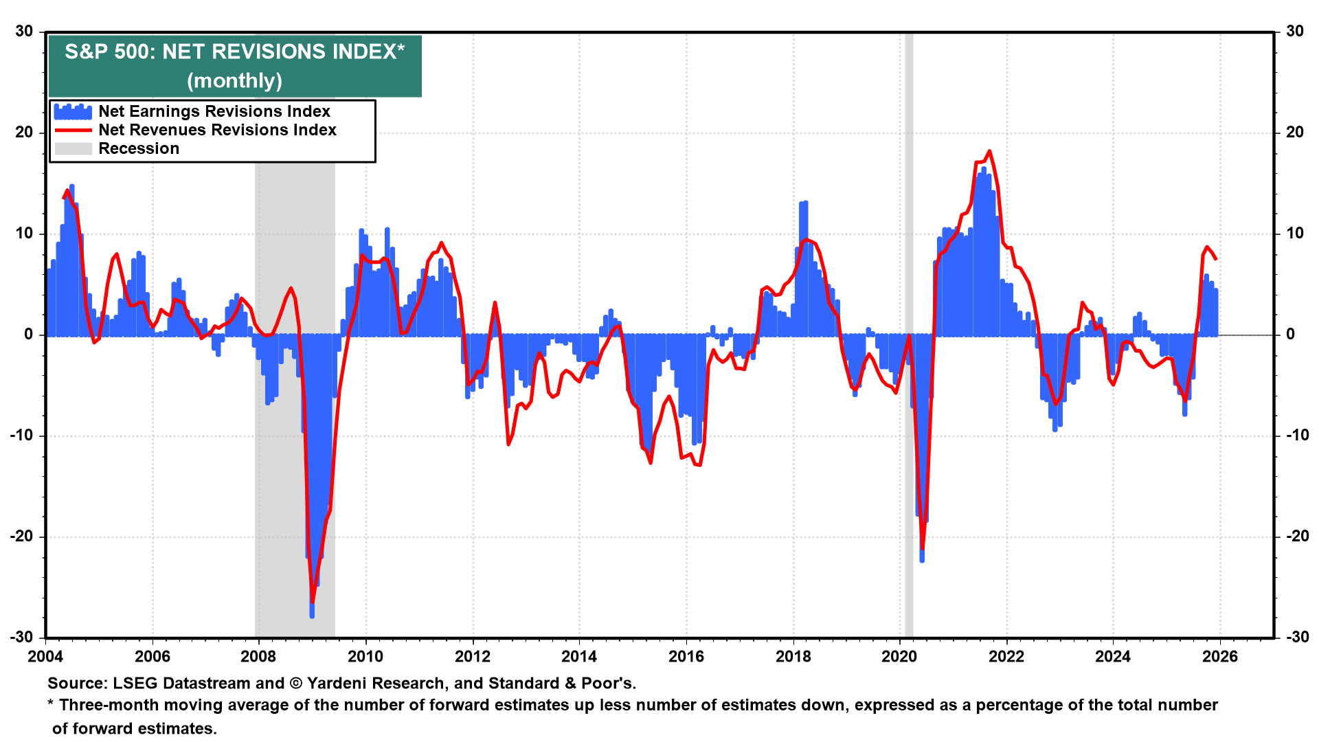 (1) S&P 500 NERI remains near four-year high. The S&P 500’s NERI index was positive for a fifth straight month in December after turning positive in August for the first time in 11 months but fell 0.7pt m/m to 4.5% and is down from a 47-month high of 5.9% in October. It’s still up sharply from a 28-month low of -7.8% in May (Fig. 12).