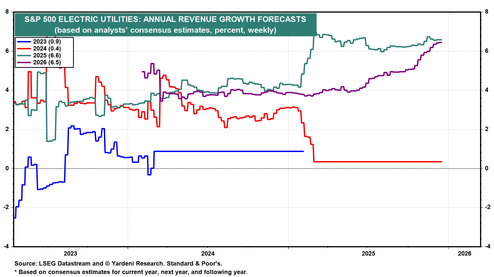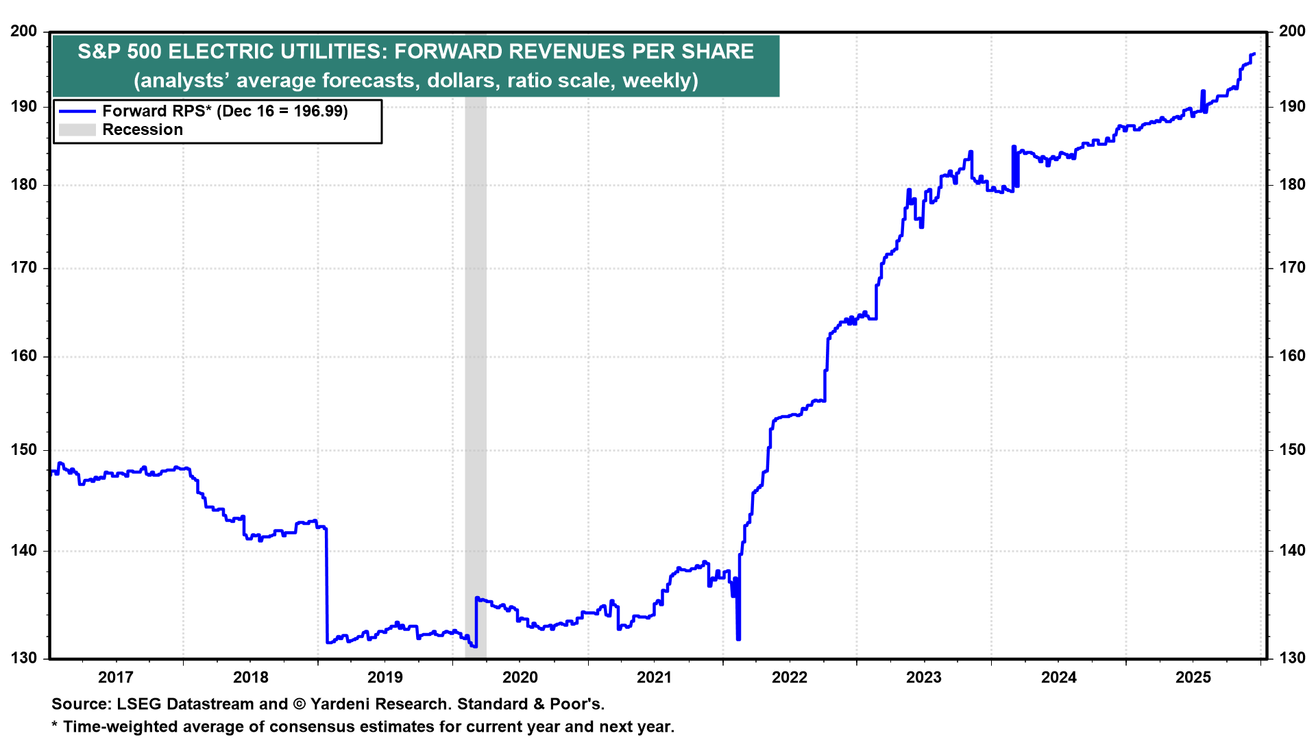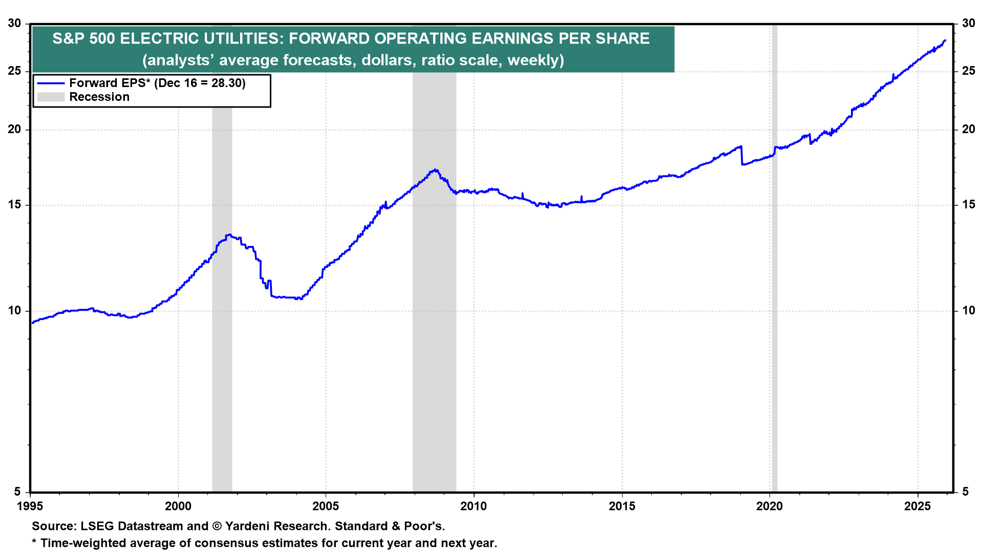 (3) What could dim the lights? Even the traditionally safe utilities sector has clouds on the horizon that should be watched. The largest appears to be growing consumer outrage over higher utility bills. Consumers don’t care that data center demand has increased, pushing up electricity prices. They see an increase in their monthly bill, and they’re letting politicians and regulators know that they’re madder than heck.