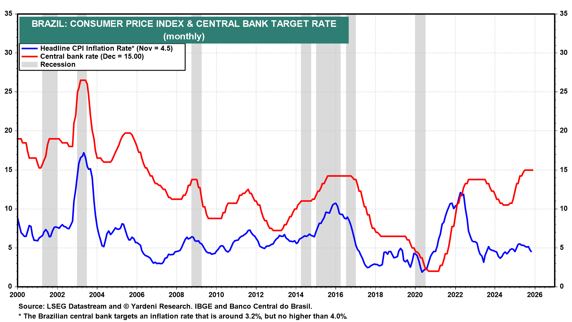 No comparison between policymakers is ideal, especially two from very different eras. Brazil’s inflation today isn’t nearly as high as the levels Volcker managed to subdue. Inflation slowed to 4.5% y/y in November (Fig. 3). This puts it back within the central bank’s tolerance range—a band of 1.5ppts above and below 3.00%—for the first time since September 2024.