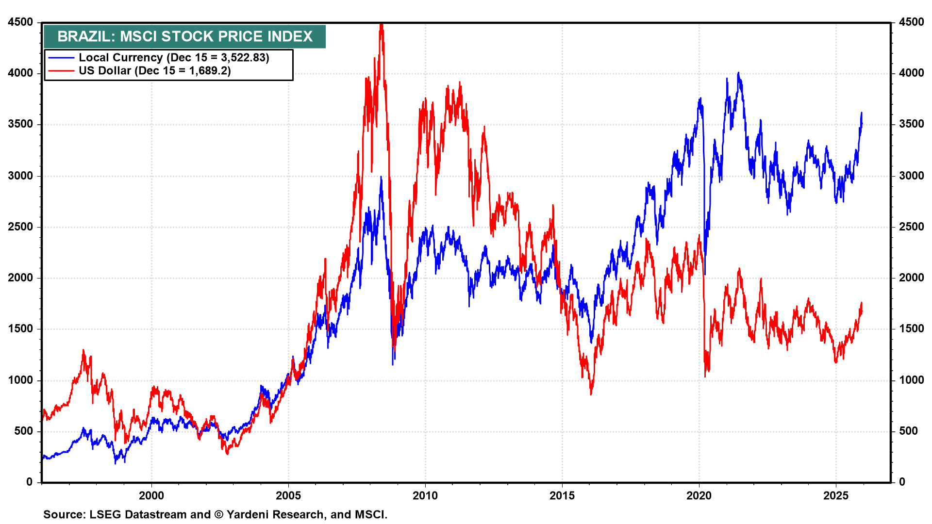 (1) Bond Vigilantes circle. Lula must be careful not to trigger the Bond Vigilantes. Ten-year bond yields are elevated historically—currently around 13.5%—as Brazil projects that its already troubling 78.1% debt-to-GDP ratio, as of September, is headed toward 100% by 2030 (Fig. 5).