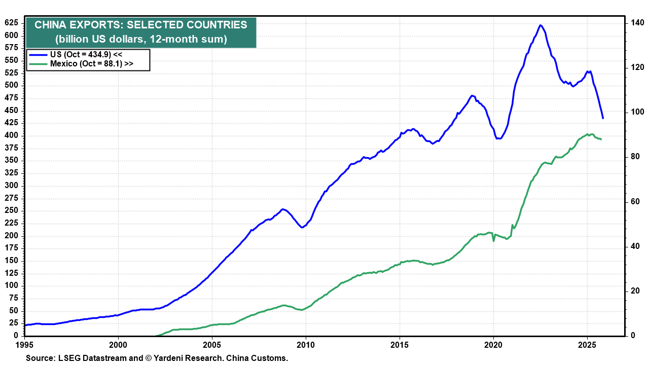 (2) Mexican backdoor. This isn’t new: Washington long has argued that China uses Mexico as a backdoor way of getting Chinese goods into US markets, not just through direct transshipment but via value-added assembly and integration into North American supply chains under USMCA. The persistent US-China trade conflicts have escalated the trend.
