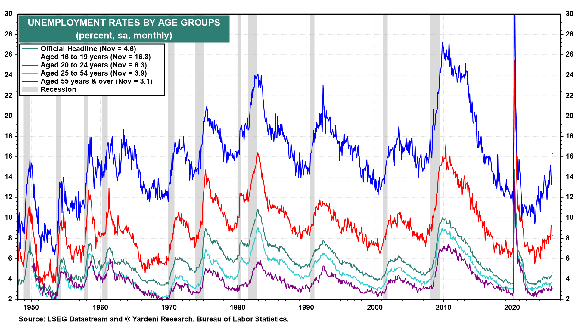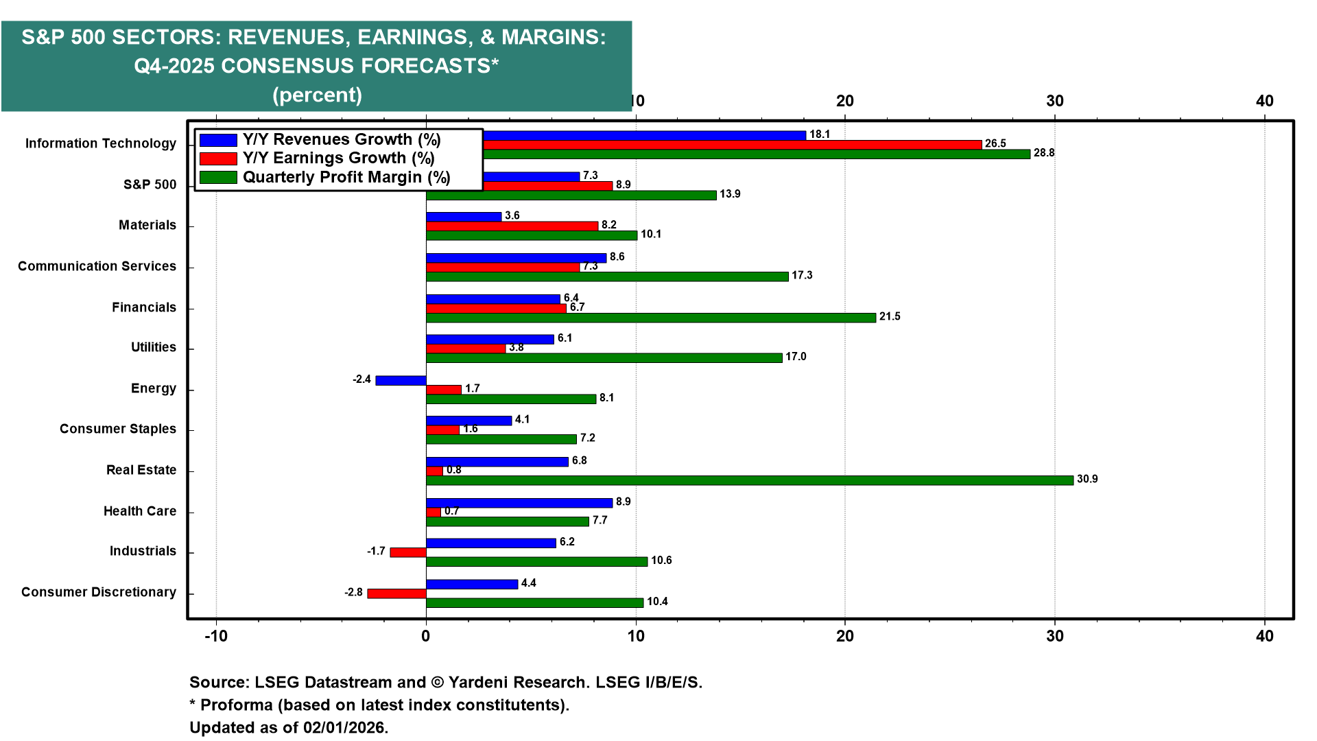 Here’s how the S&P 500 sectors’ consensus earnings growth rates stack up for Q4-2025: Information Technology (26.5%), S&P 500 ex-Energy (9.2), S&P 500 (8.9), Materials (8.2), Financials (6.7), Communication Services (7.3), Utilities (3.8), Energy (1.7), Consumer Staples (1.6), Real Estate (0.8), Health Care (0.7), Industrials (-1.7), and Consumer Discretionary (-2.8).
