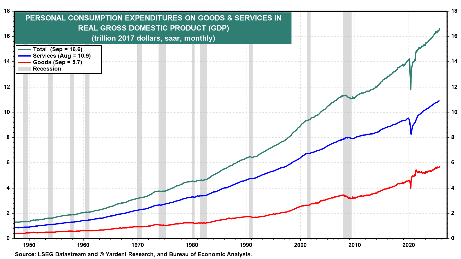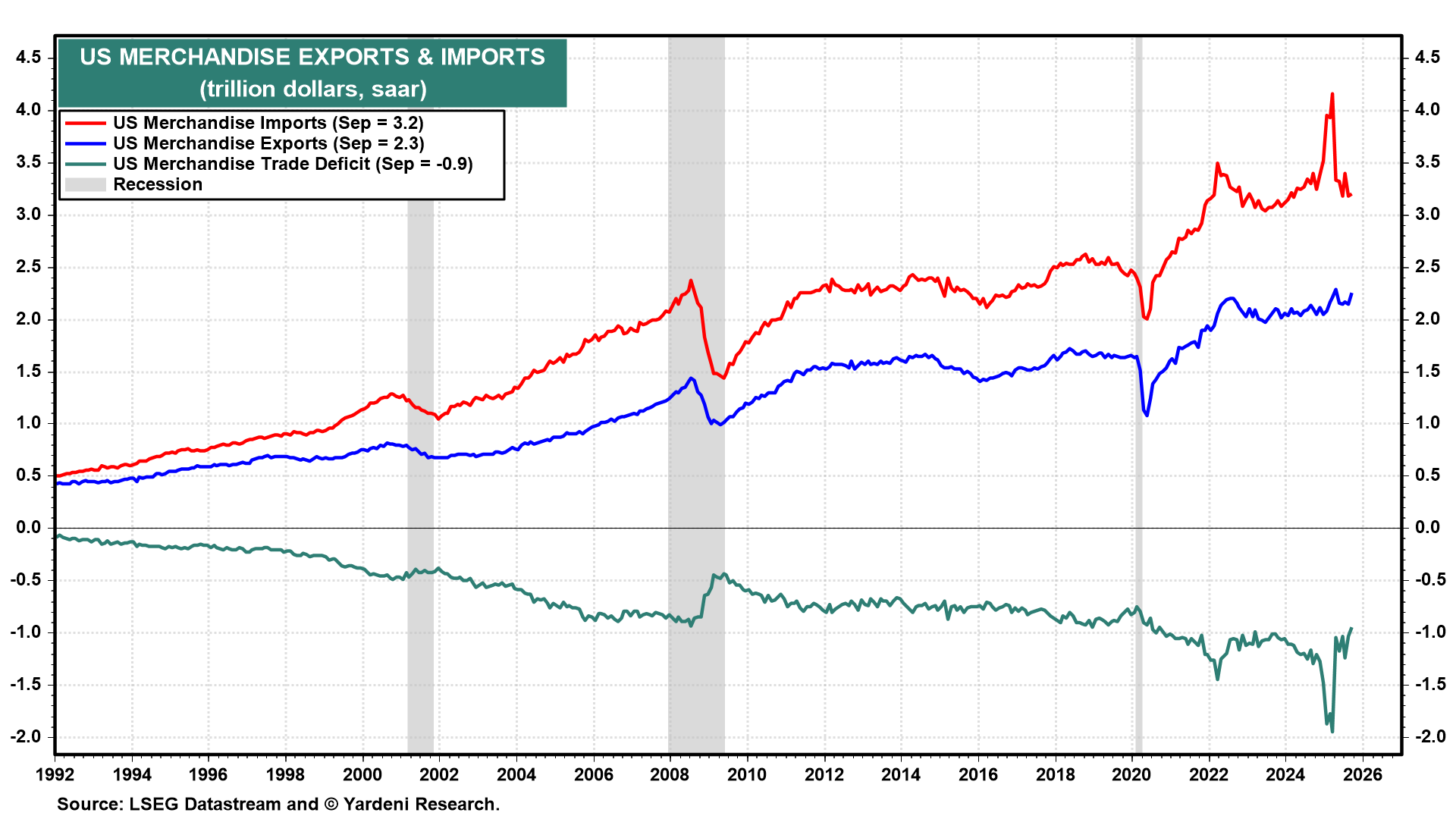 (2) Lower tariffs than feared. The porous nature of the tariff wall explains why it’s had a smaller economic impact than conventional wisdom expected. On paper, the US tariffs announced since early April—when President Trump began announcing double-digit rates on countries worldwide—are the highest since the days of President William McKinley 125 years ago and higher than the levels of the 1930s Smoot-Hawley Tariff Act presaging the Great Depression.