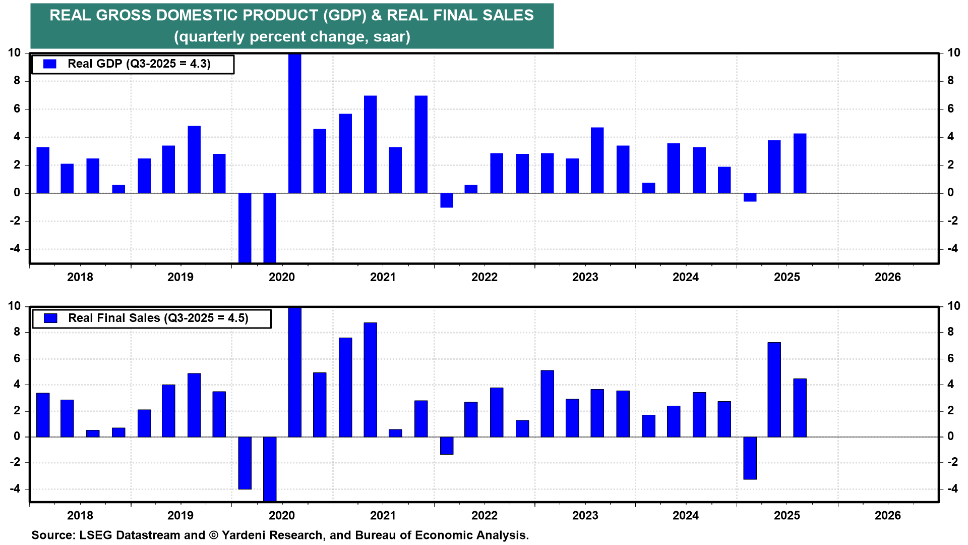 We expect the typical earnings surprise “hook”—i.e., the sudden uptick in the charted estimates data once actual results are tacked on—to peg Q4-2025’s final y/y growth at a double-digit percentage rate for a fifth straight quarter. That would also mark the S&P 500’s tenth straight quarter of positive y/y earnings gains, the longest such stretch since the 12 quarters ended Q2-2019.