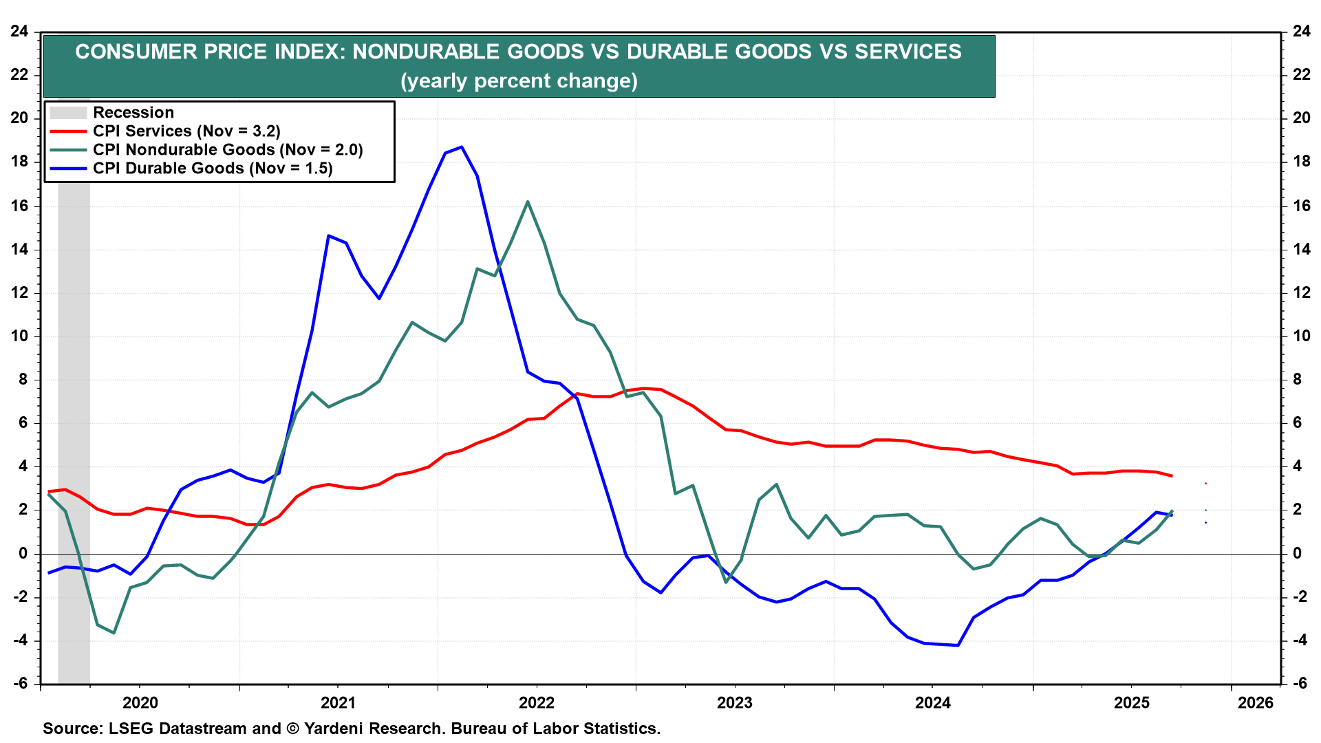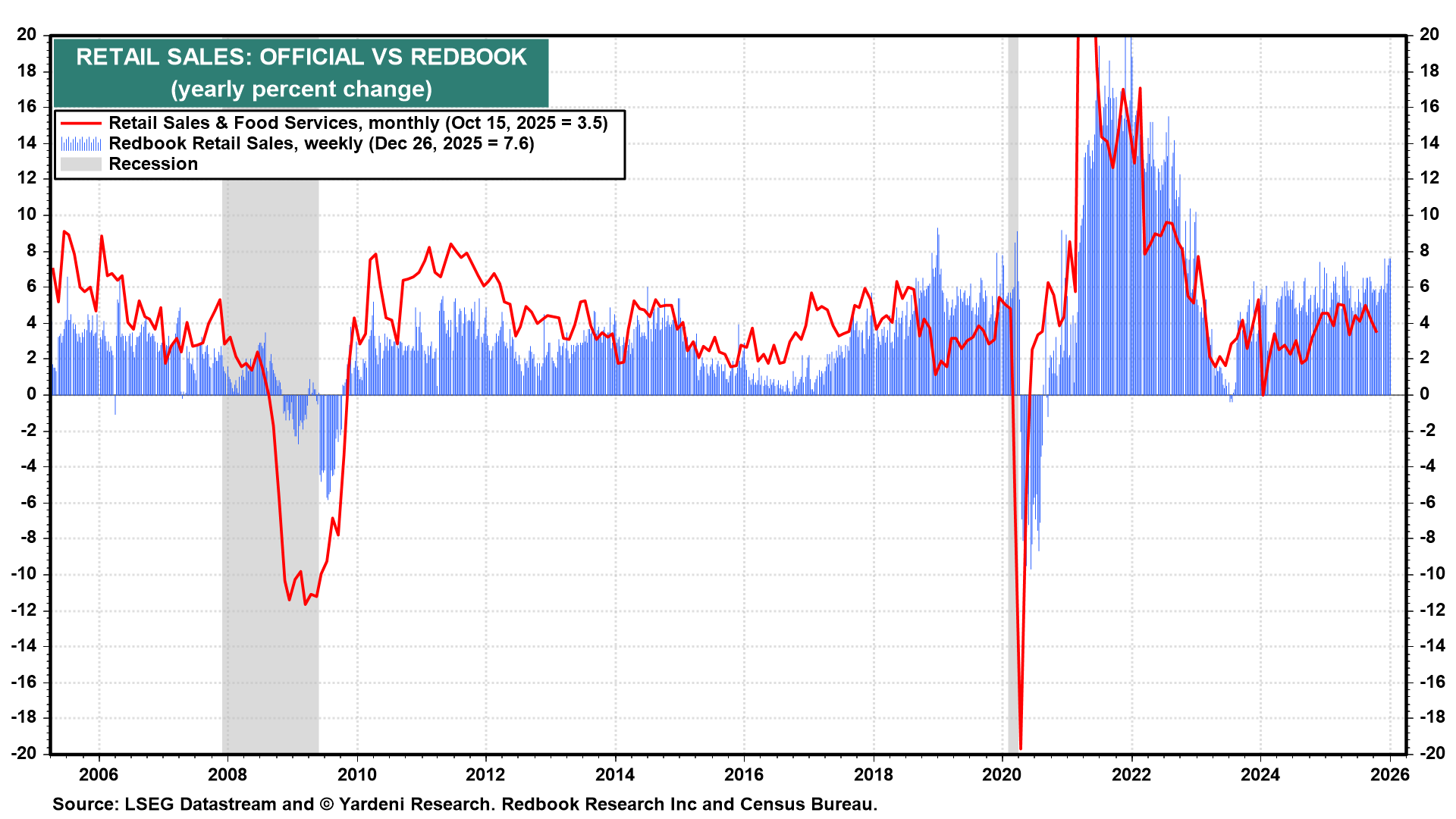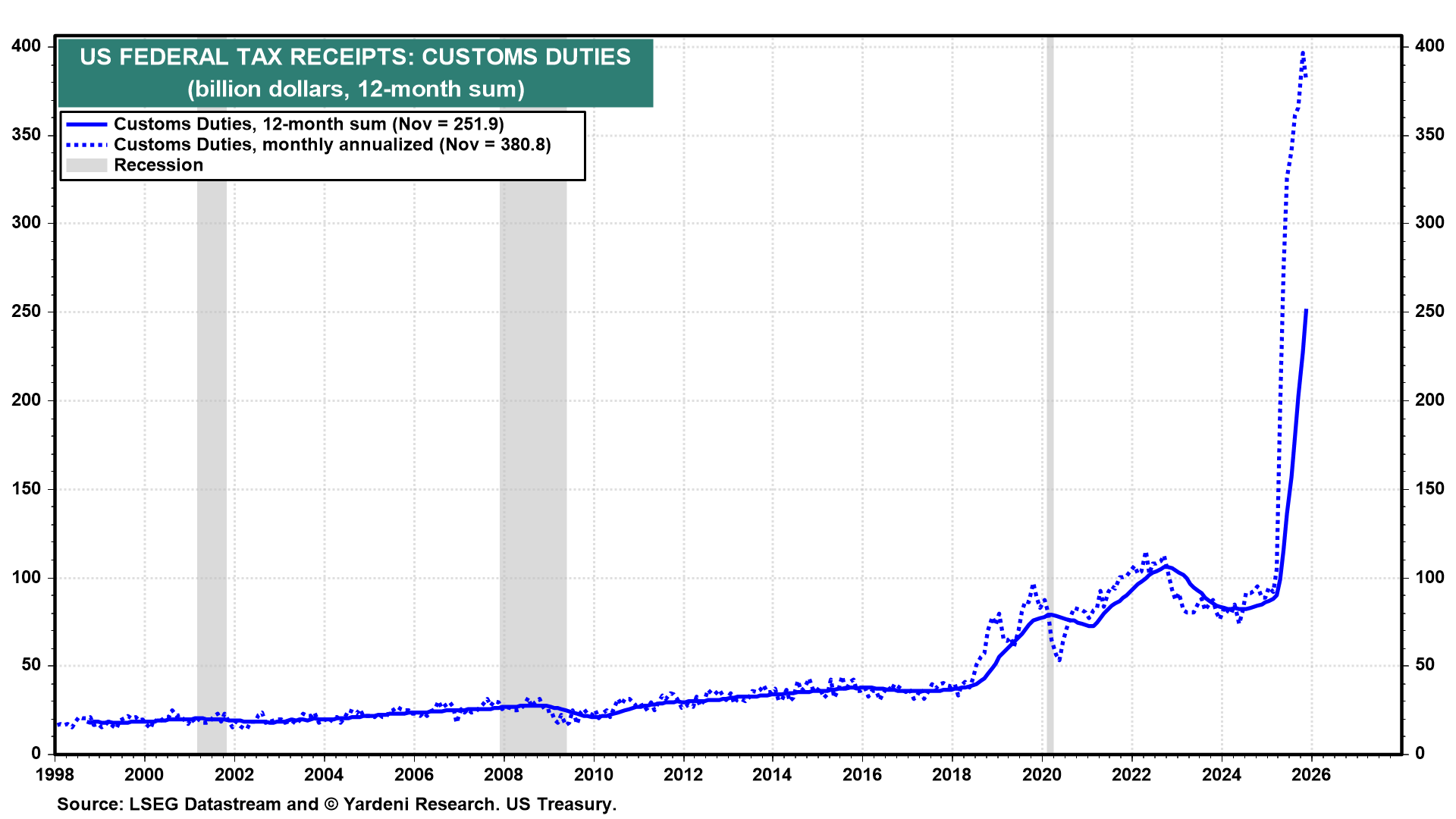 (1) Carveouts galore. Recent weeks saw fresh headlines about carveouts and delays. On New Year’s Eve, a Trump executive order delayed a planned increase in the import tax on kitchen cabinets from 25% to 50% until January 1, 2027. Import duties on upholstered furniture also received a reprieve from plans to increase tariffs from 25% to 30%. The news calmed nerves in China and Vietnam. Italy got calming news too: The Commerce Department is scaling back planned tariffs on 13 pasta makers.