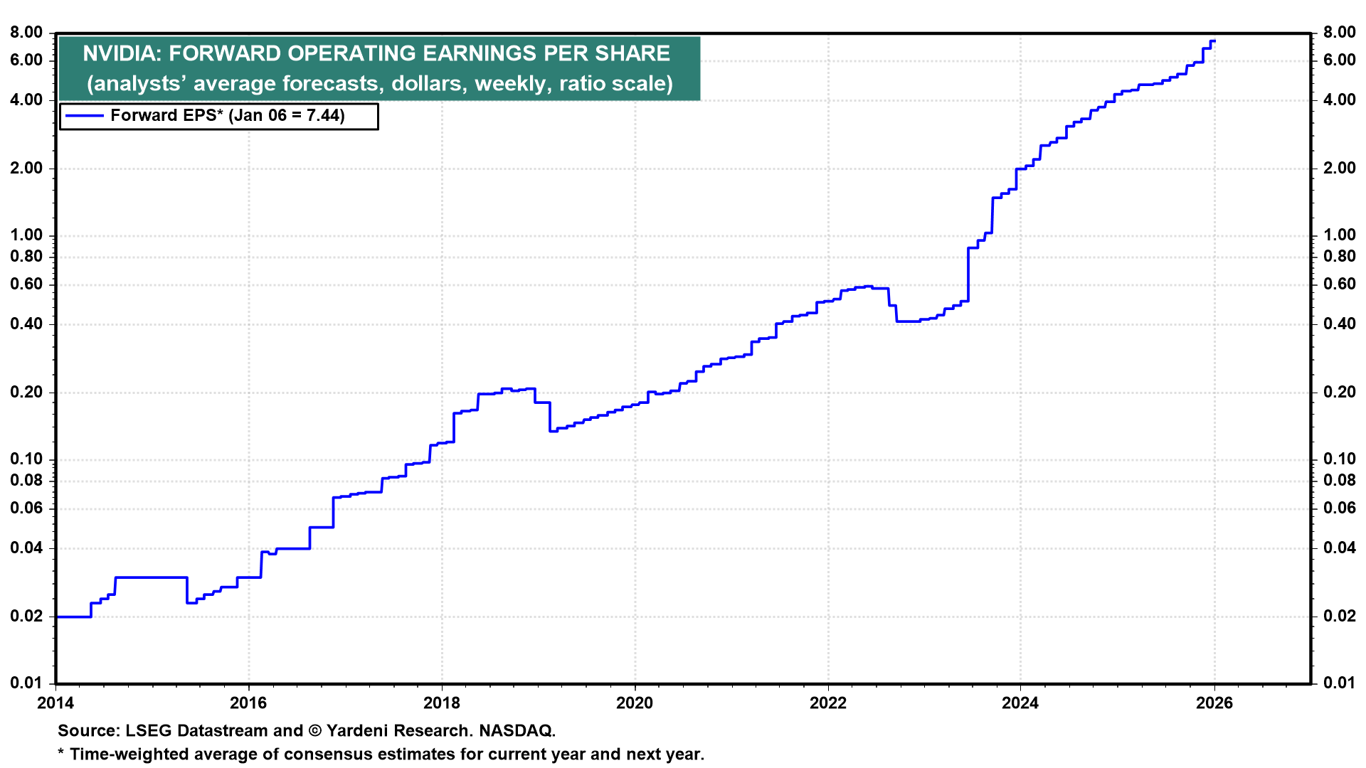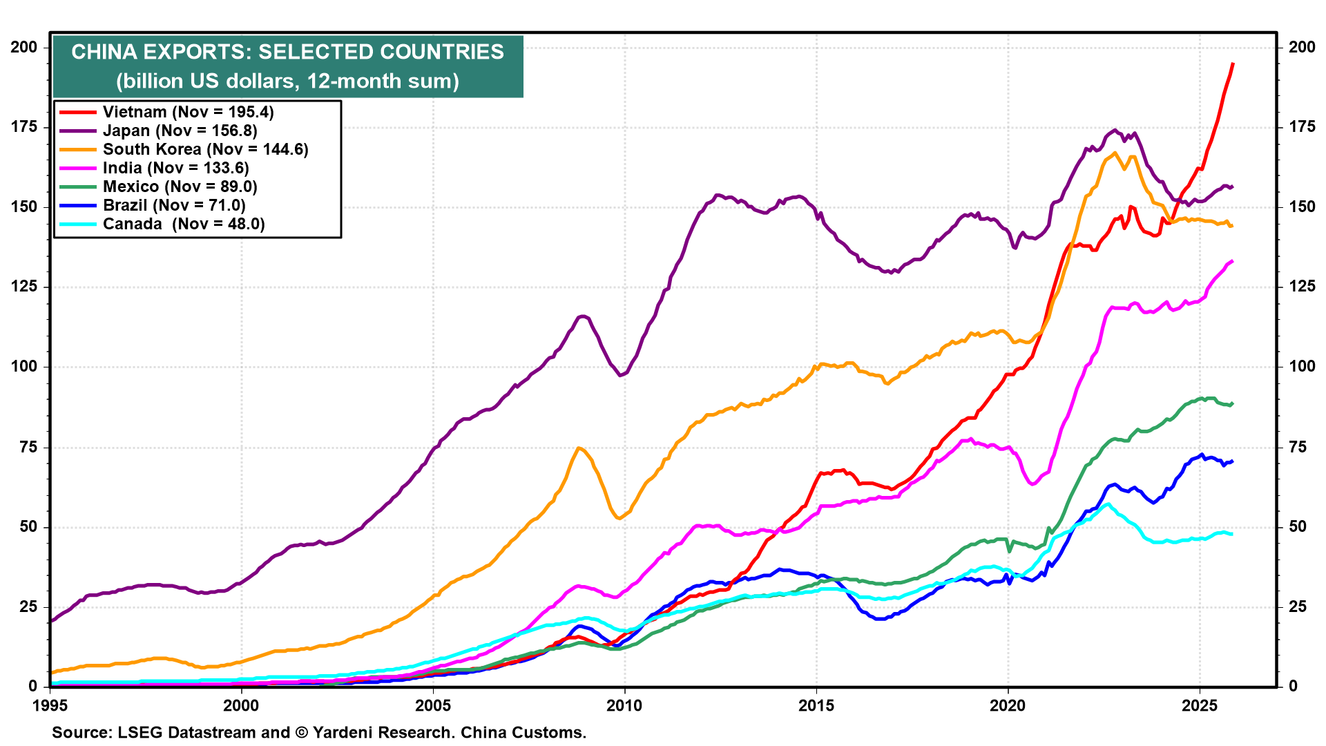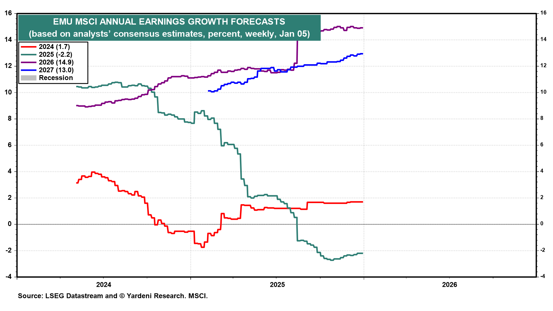 Executive Summary: President Trump’s Venezuelan gambit may give China cover to tighten the noose around Taiwan. That could slam global markets and supply chains, William writes, as well as unnerve global AI investors envisioning Taiwan Semiconductor winding up in China’s control. … Also: In the EV market race, BYD is running circles around Tesla. But whether that will remain the case is questionable. … And: In Europe, gradual fiscal stimulus is keeping the economic backdrop stable, Melissa reports, which is keeping stock markets moving higher. Forward P/Es have been capped around 15 since March. … Also: Joe says the absence of Q4 earnings warnings by managements of S&P 500 companies could set the stage for yet another epic earnings quarter.