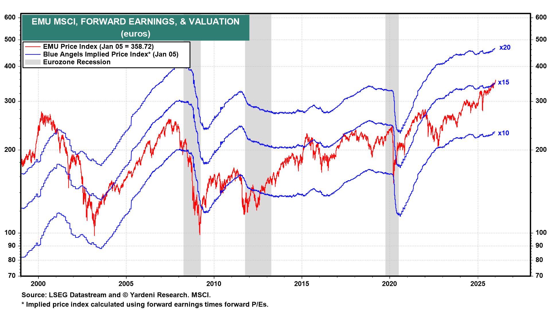 The stable economic backdrop, supported by fiscal stimulus, has helped to push the Eurozone MSCI price index up steadily by 11.8% from July 1, 2025 to January 5. Since March 2025, the forward P/E has remained near 15; it crossed above that mid-range historical marker during the final quarter of last year. The index now trades at a multiple of 15.1 (Fig. 1).