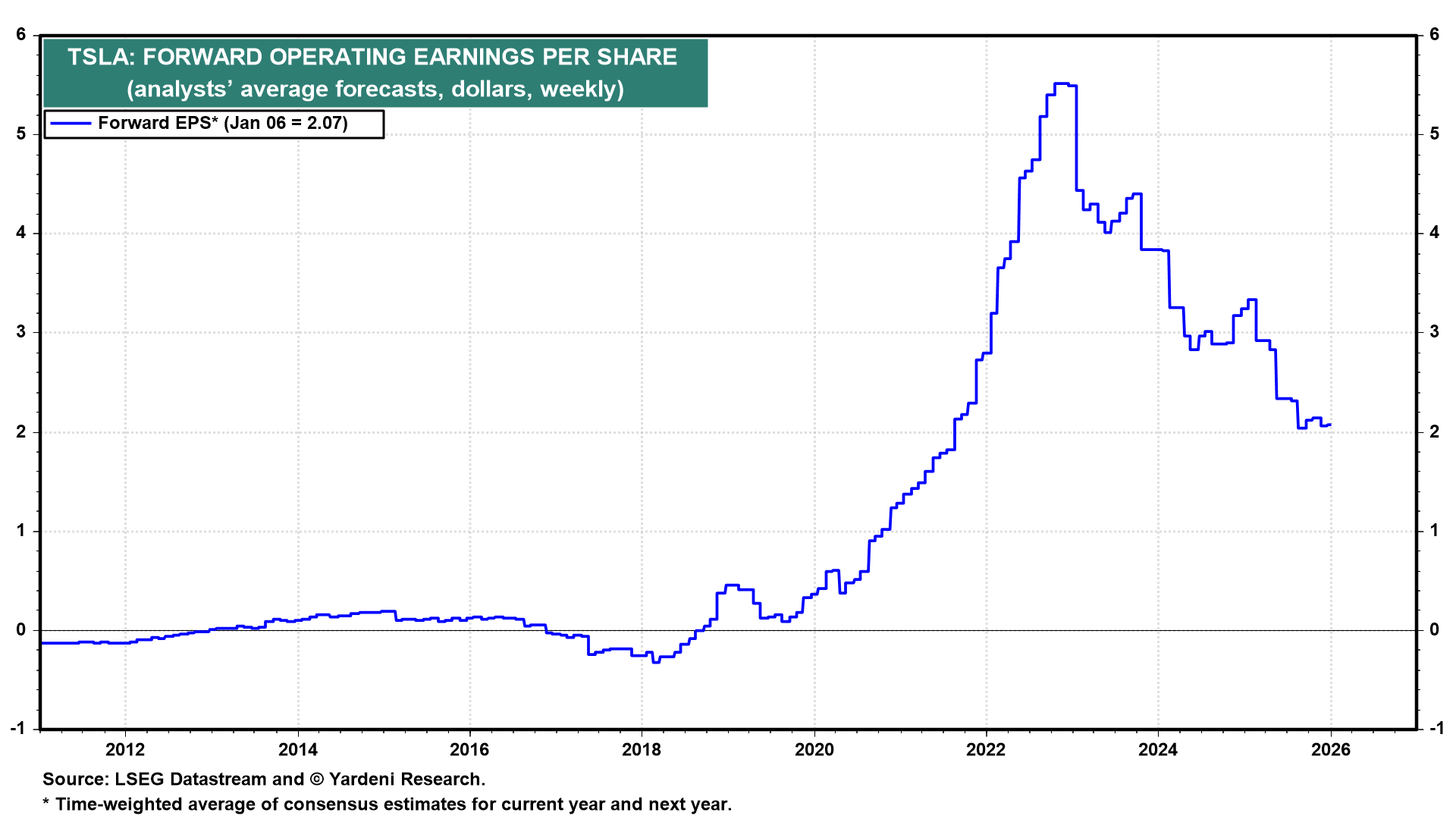 (3) Tesla roars ahead. The Automobile Manufacturers industry enjoyed the largest forward P/E surge in the S&P 500, rising from 44.1 a year ago to 61.6 as of Tuesday. Much of the credit goes to Tesla. Investors stopped focusing on declining electric vehicle sales and instead began dreaming about the potential for Tesla’s humanoid robots. Tesla’s forward operating earnings per share fell to $2.07 currently from $3.25 at the start of 2025, and its forward P/E soared to 208.8 from 132.8 (Fig. 10 and Fig. 11).