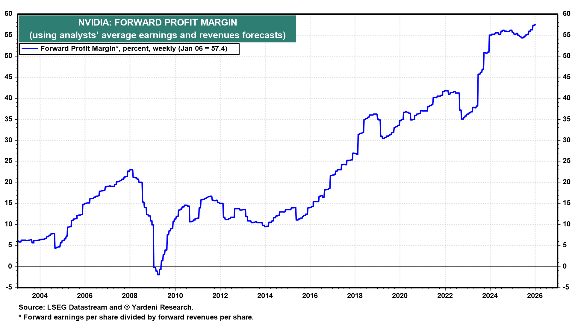 Yet in the wake of Huang’s presentation, Nvidia shares barely budged. In fact, the stock is down 9.6% since its October 29 peak (Fig. 1). Despite Nvidia’s leadership position in the hottest tech market, its shares are notably inexpensive relative to expectations for its fundamentals: Forward revenues, forward profit margin, and forward operating earnings per share each are at record levels (Fig. 2, Fig. 3, and Fig. 4).