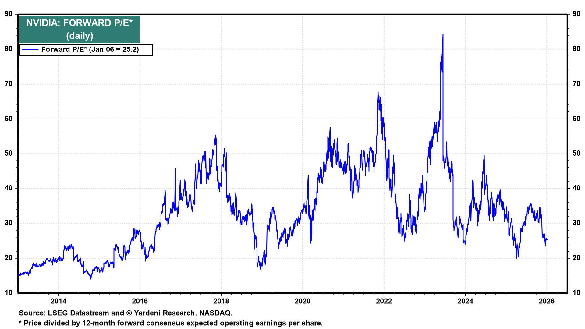Executive Summary: Nvidia no longer seems as competitively invincible as it once did. Jackie surveys the increasingly crowded AI chip playing field that could act like gravity to Nvidia’s earnings growth. … Also: When a stock market goes a year with broad-based share price appreciation yet little change in valuation multiples, that’s a strongly supported market. Earnings growth accounted for the advances in companies’ and industries’ stock prices enjoyed over the course of 2025. … And: Someday, quantum computers will be able to break today’s encryption codes, but when “Q-day” will come is uncertain. The government is developing post-quantum cryptography standards that it would behoove companies to adopt ASAP.