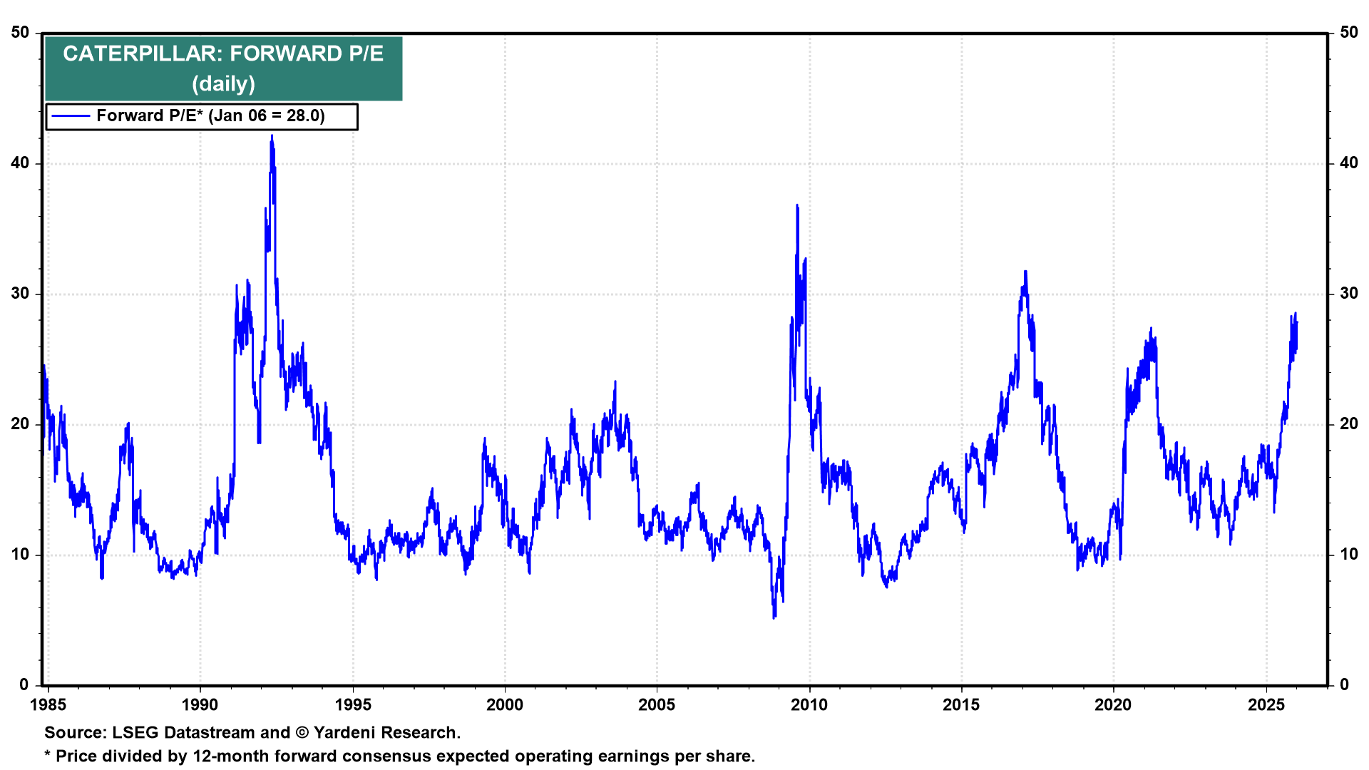(2) AI helps Industrials. The S&P 500 Industrials sector’s forward P/E increased by 2.1 points. Construction Machinery & Heavy Trucks did the heavy lifting. That industry’s forward P/E leapt to 22.6 as of Tuesday, up from 15.9 a year prior, thanks much to the excitement surrounding the construction of AI data centers that boosted Caterpillar shares by 70% (Fig. 7). The company’s forward P/E increased with its good fortune to 28.0, up from 16.5 a year earlier (Fig. 8).