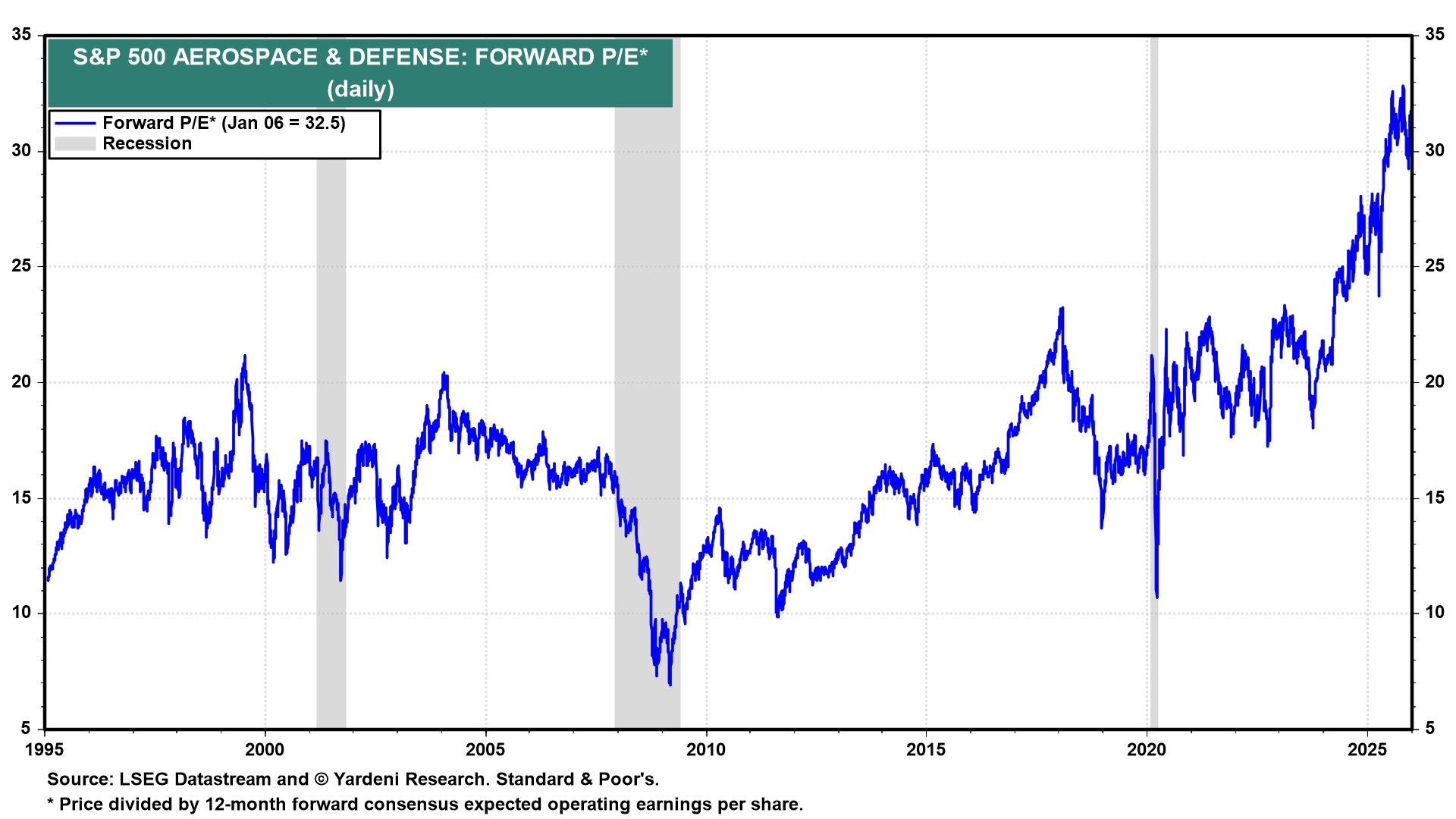 The industry is in President Trump’s crosshairs and could face turbulence. On the one hand, President Trump issued an executive order yesterday that seeks to cap defense companies' executive pay, stock dividends, and share buybacks in an effort to prod the companies to hit delivery targets on time and invest in their factories to increase production. On the other hand, the President said yesterday that he'd like US military spending increased to $1.5 trillion in 2027, up from the $901 billion 2026 budget, to pay for his “Dream Military.”