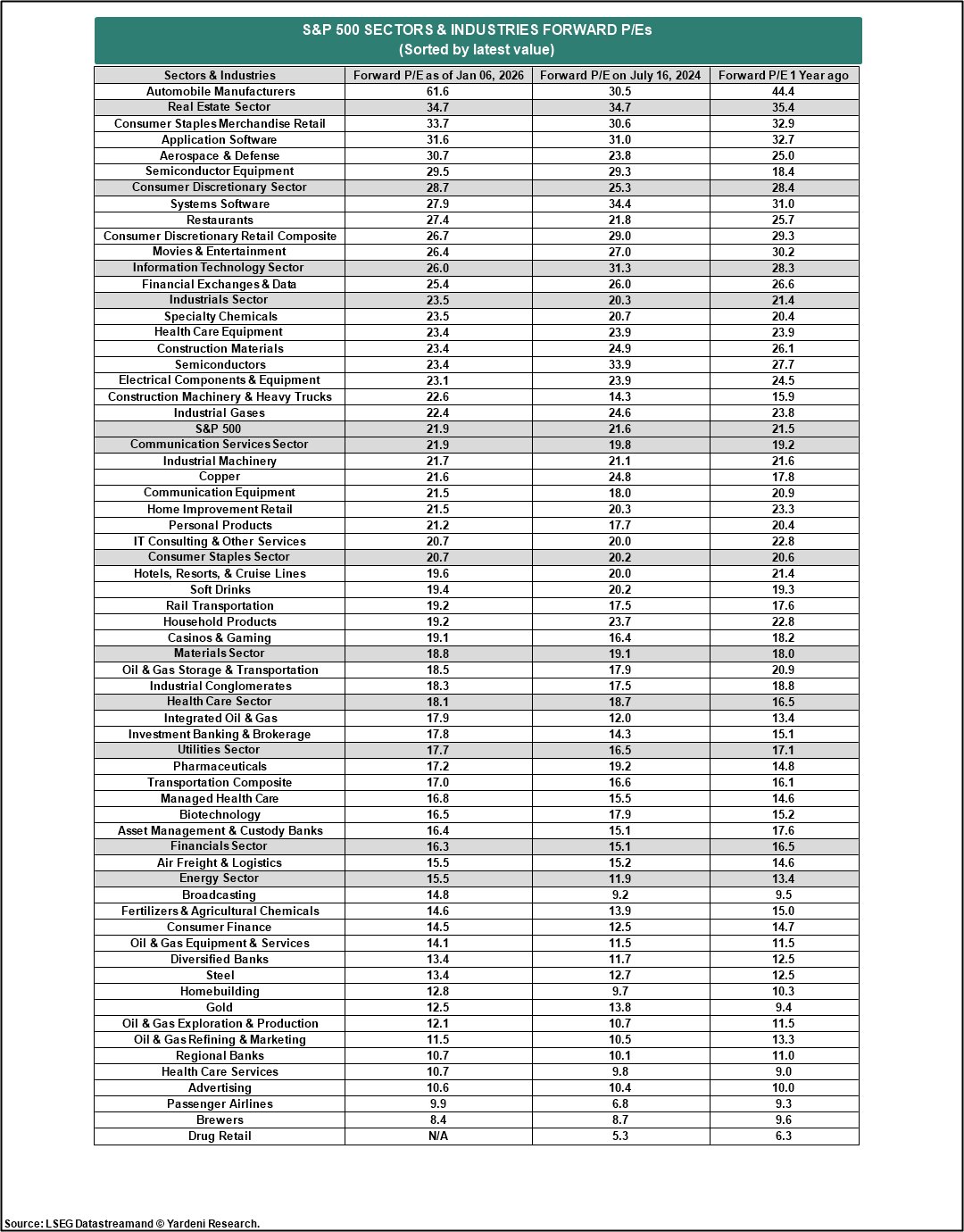 (1) Tech P/E dips. Perhaps most surprising is the dip in the S&P 500 Technology sector’s forward P/E compared to last year, even though the sector’s stock price index gained 23.3% in 2025. Tech industries that saw their forward P/Es contract over the past year include Application Software (31.6, 32.7), Systems Software (27.9, 31.0), and Semiconductors (23.4, 27.7), which was slightly offset by the jump in the forward P/E of the Semiconductor Equipment industry (29.5, 18.4).
